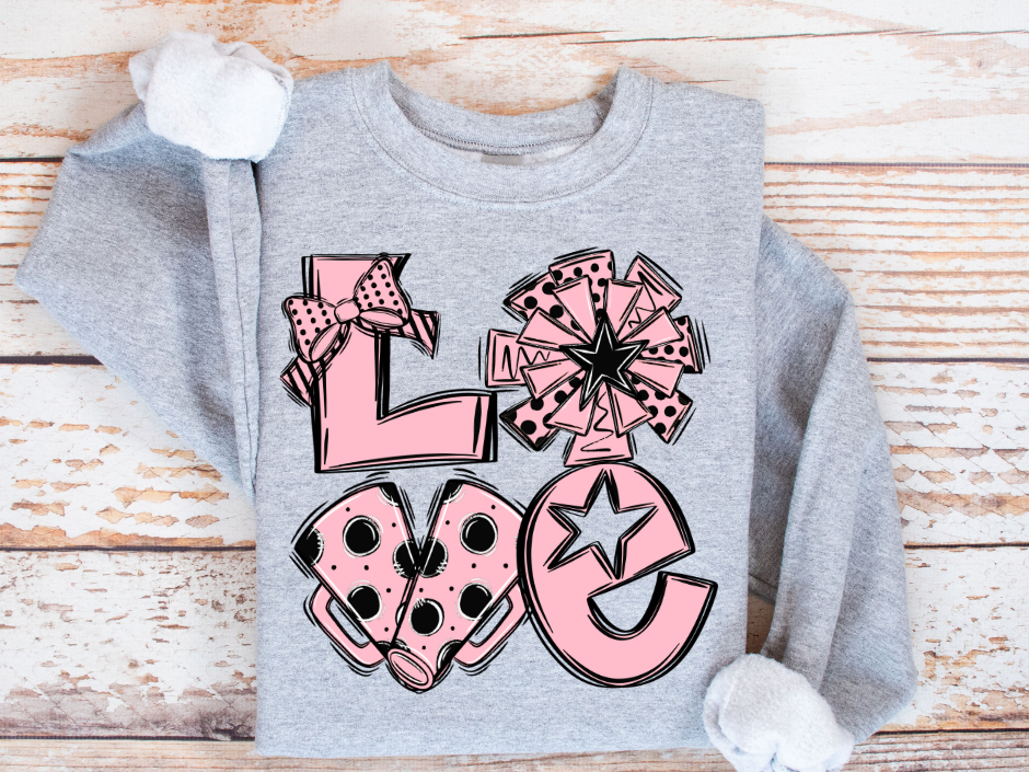 ✅ Features a cheer bow, megaphone, pom, and star in a bold LOVE layout