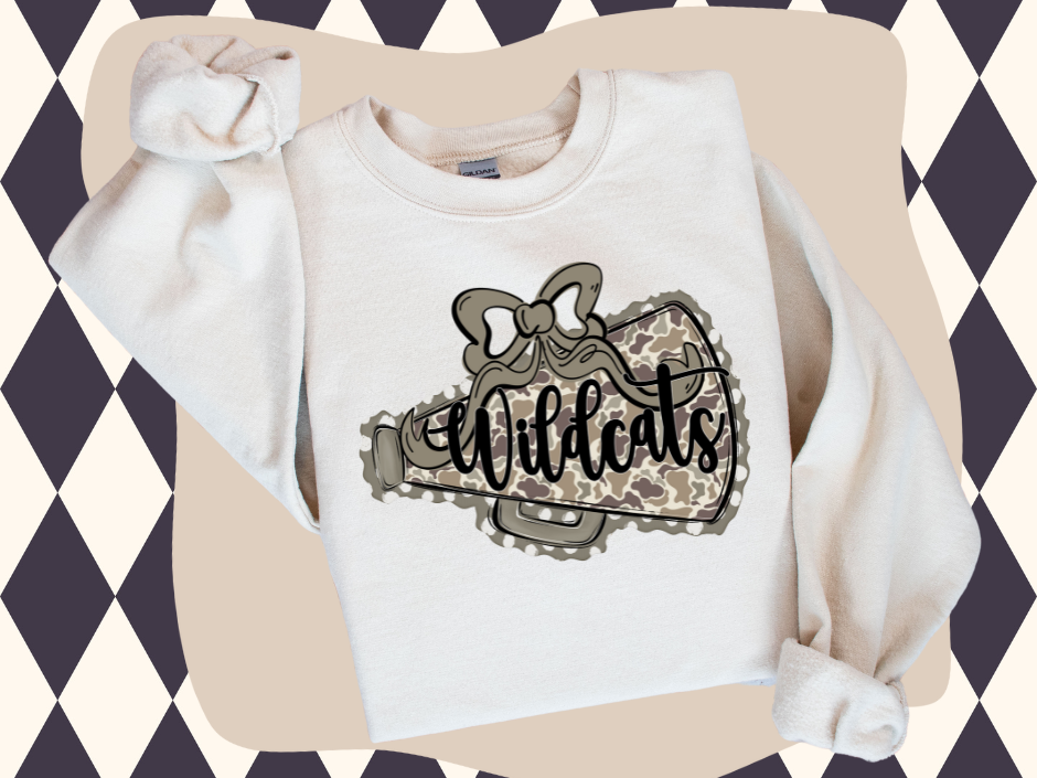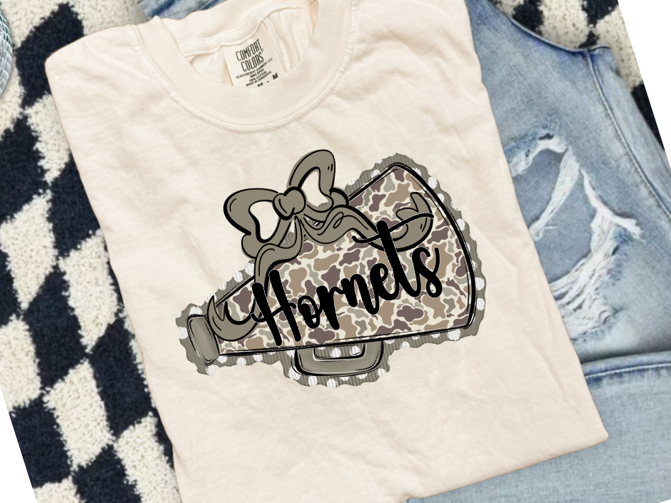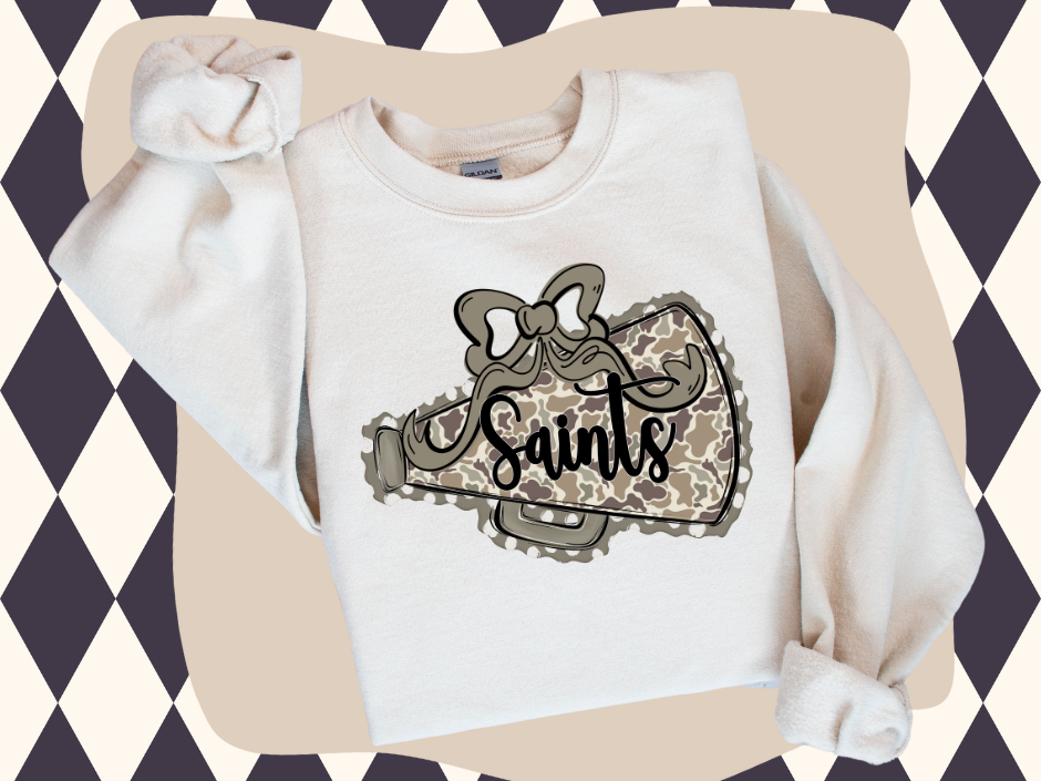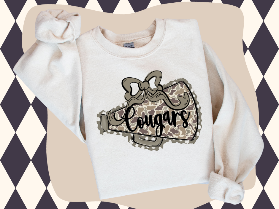 Spirit, sass, and a little camo class! This cheer megaphone design is full of personality with its bold lettering, polka dot bow, and trendy camo print. Perfect for cheer moms, fans, or anyone ready to shout their spirit from the sidelines!