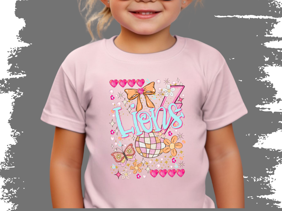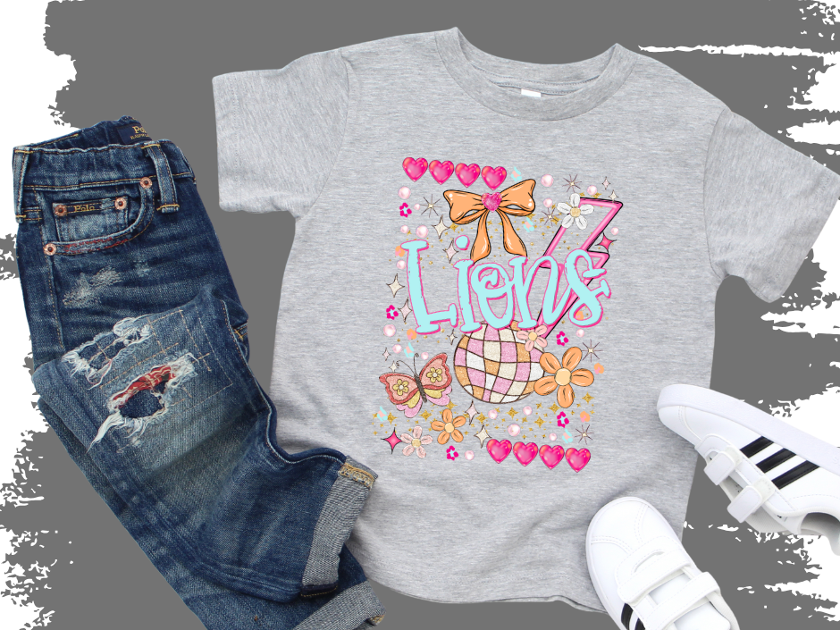 Full of color, charm, and Lions pride, this tee is a little fan’s dream come true! With sweet hearts, flowers, butterflies, a disco ball, and a big bold bow, it’s a playful twist on school spirit that’s ready for any occasion.